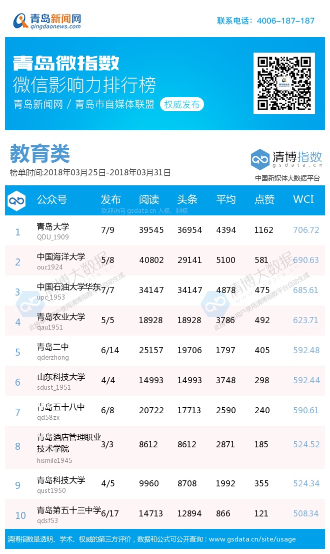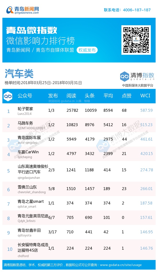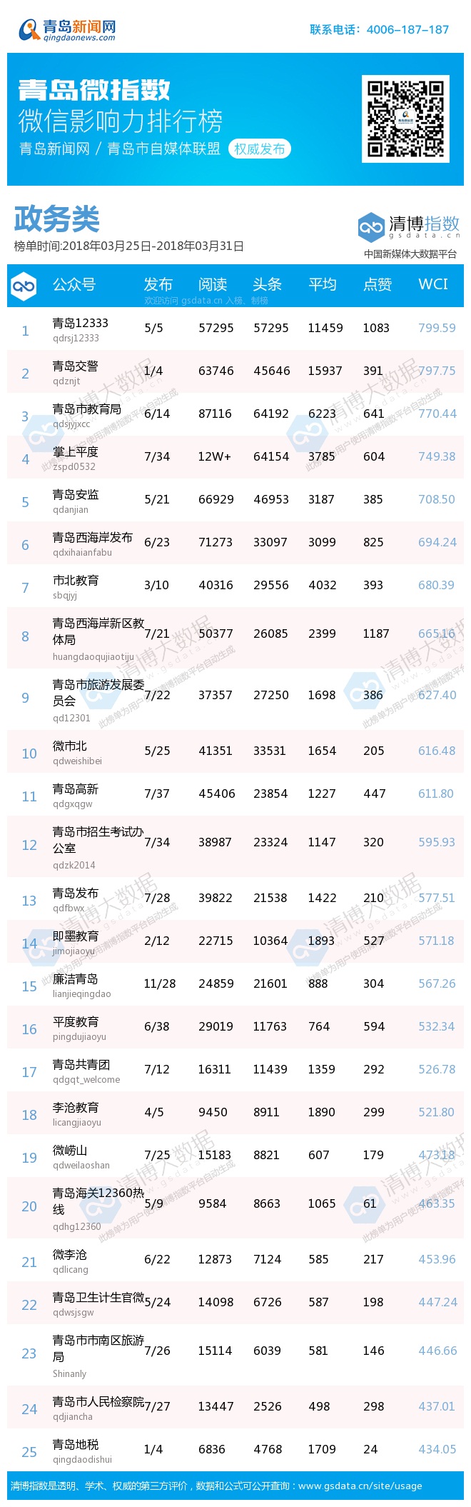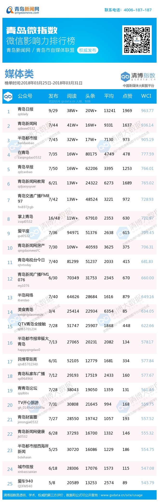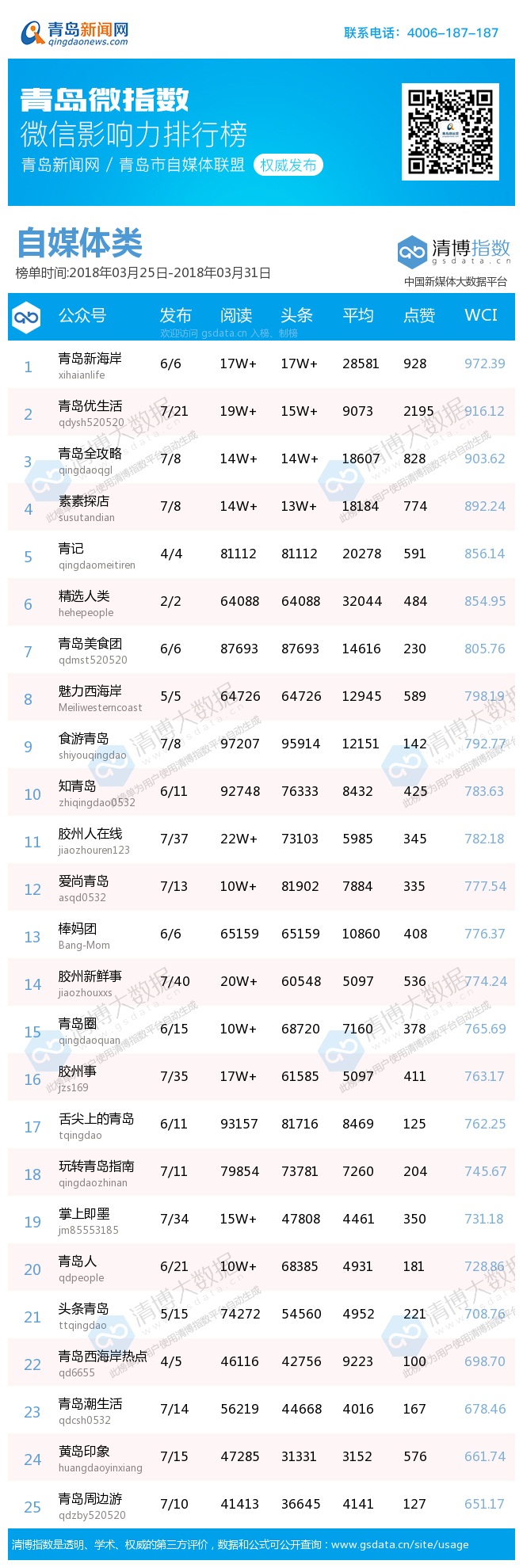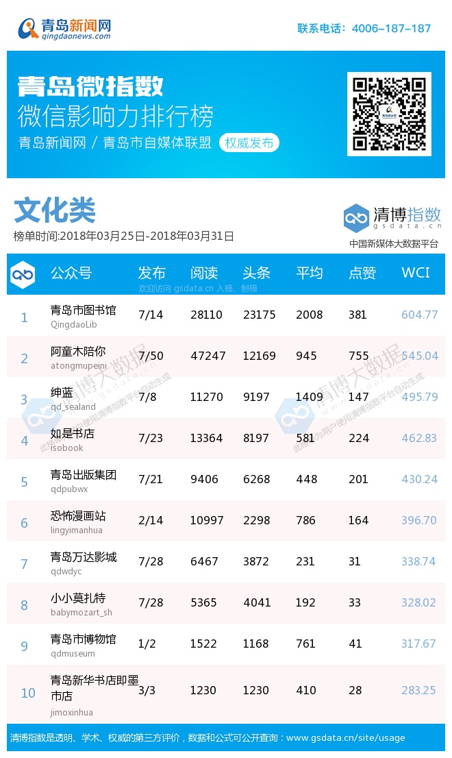3、本次榜单收录了青岛14个行业微信公众号,如您的账号暂未收录,可联系4006-187-187。