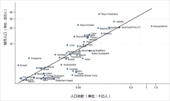 回过头再来看中国的情况,近年来总有人觉得北上广深这些一线城市实在是太大了,甚至主张控制城市的人口规模。但实际上,中国的一线城市不是偏大而是偏小了。下图显示了各国的总人口和最大城市人口之间的关系。横轴是一国的人口规模(对数刻度),而纵轴是该国最大城市的人口规模。该图表明,一国人口规模与其最大城市人口规模之间存在明显的正相关关系。毫无疑问,一个国家的人口数量越多,则该国居住在最大城市中的人数就越多。