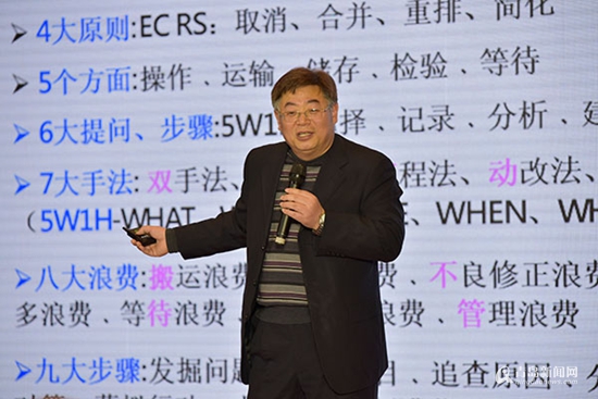 他总结了实现精益生产的方法,即一大准则——动作经济原则;两大支柱——IT与自动化;“三现主义”——现实、现地、现物;四大原则——取消、合并、重排、简化;五大方面——操作、运输、储存、检验、等待;以及六大提问、七大手法、八大浪费、九大步骤。“其中不仅会涉及到目视化、班组管理、价值流管理、放错技术等精益工具的使用,还包括精益制度、精益文化的建设。”张教授表示。