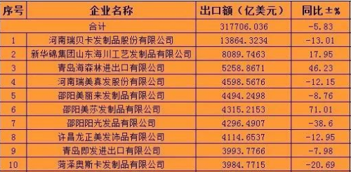 细分到发制品企业,河南瑞贝卡依旧稳坐第一名宝座;新华锦集团山东海川紧排第二;青岛海森林本次挤入第三名。