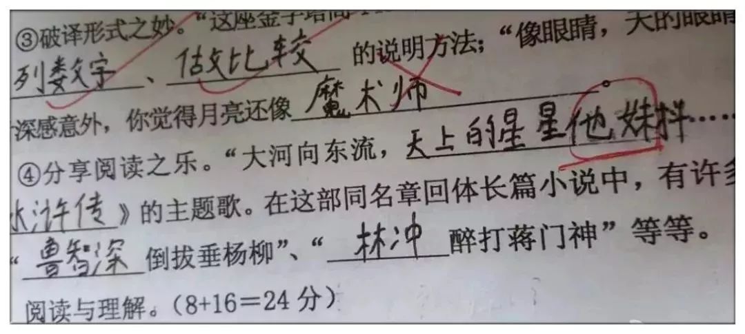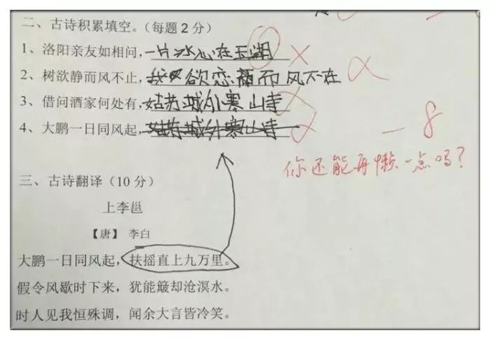 某语文老师分享的试卷答案,问“大河向东流”的下句,呵呵....