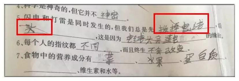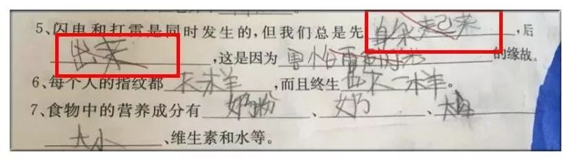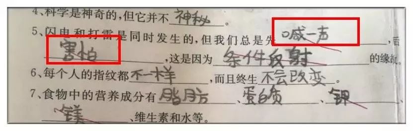科学课老师分享的一组试卷答案,大概意思是要学生填:先(看到闪电),后(听到打雷),然而...