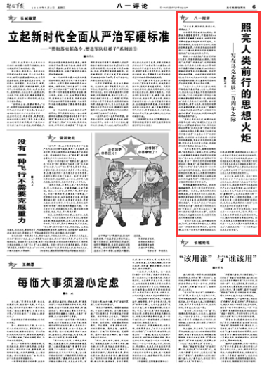 今年是马克思诞辰200周年。中国共产党这个“行动的马克思主义者”,创造出了马克思主义的“中国版本”,使中华大地发生了“堪称人类历史上最伟大的故事”。这是马克思主义的真理性之所在,也是马克思主义的理论力量之所在。请关注今日出版的《解放军报》的详细报道——