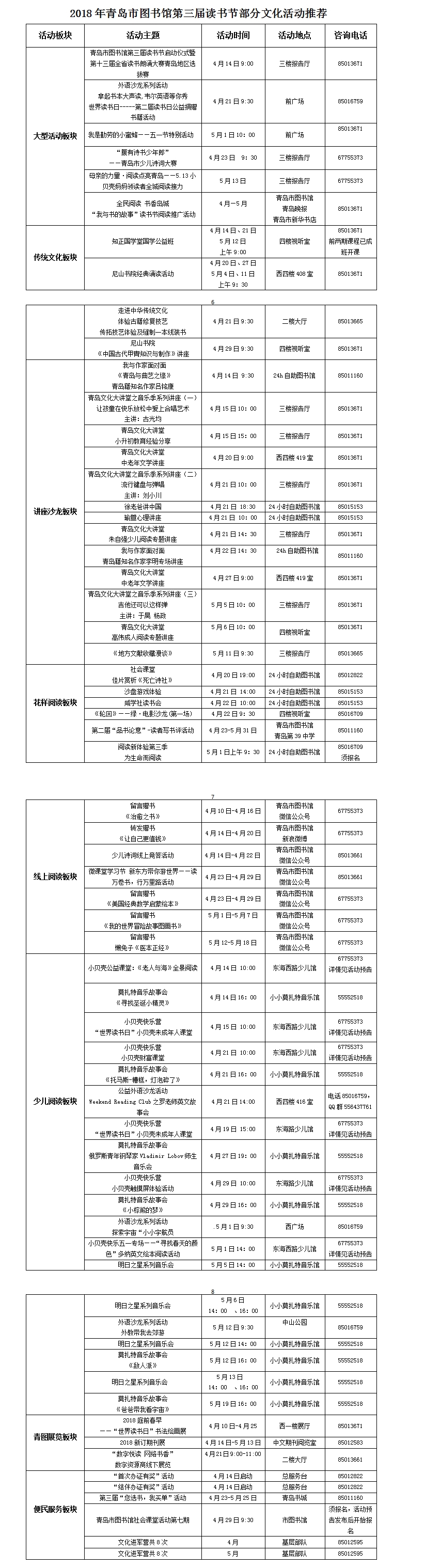 温馨提示:读书节期间各活动详情请登陆青岛市图书馆网站www.qdlib.net或关注青岛市图书馆微信公众号了解。