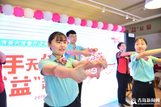 为了“天使”员工更好地发展,“天使餐厅”由原百丽广场餐厅乔迁至东海中路餐厅。在残障员工关爱方面,“天使餐厅”建立“天使”员工家长通讯录,每月召开家长会,让家长及时了解员工在餐厅的工作状态;及时对表现好的“天使”员工认同鼓励;为了便于与残障员工的沟通,“天使”餐厅全体员工学习常用的手语。“天使”员工活动更是多种多样,草莓采摘、登山、感恩节烘焙制作以及参与青岛马拉松比赛等,这群可爱的人在这个大家庭尽情的展现自己的精彩。庆典现场,每个“天使”员工都是那么开朗乐观,非常自信地展现自己,他们一起表演了手语节目《梦在前方》,用这首歌表达了自己奋力逐梦的心情,看着坚强乐观的他们,现场观众无不动容。