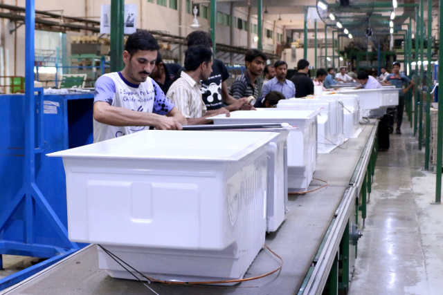 ▲在海尔巴基斯坦鲁巴经济区冰箱车间,工人在生产线上作业(资料照片)。新华社发