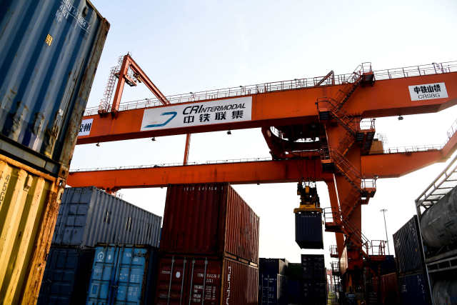 ▲5月7日,在“中铁联集青岛中心站”,龙门塔吊往“青岛号”中亚国际班列上装载货物。新华社记者 李紫恒 摄