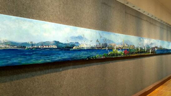 王广尧、周维明两位老艺术家合力创作,一副浩荡长卷,用摄影和油画的双重艺术形式展现了青岛独特的海湾灵魂。现场80米长的巨幅油画展出让人叹为观止,灵山湾、唐岛湾、金沙滩湾、胶州湾、团岛湾、青岛湾、汇泉湾、太平湾、浮山湾、麦岛湾、老龙湾、崂山湾,青岛七百八十公里的海岸线上最具代表性的十二个海湾自西向东在画卷上跃然涌动,让人看得畅快。