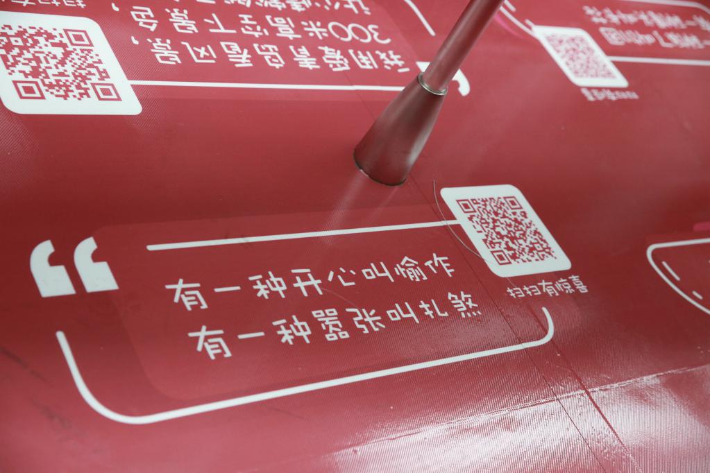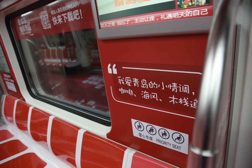 这列“爱青岛专列”采用了红色的主题色,与地铁2号线的代表颜色完美融合,彰显了青岛这座城市的蓬勃朝气。在这列特殊的列车中,记者看到,车门、车窗以及地面上都写满了各种青岛人的“心声”——“我爱青岛的小情调,咖啡海风木栈道”“我爱青岛大嫚,洋气爽快哈酒不叨叨”……除此之外,例如“扎煞”“布噶”“误银猫”等妙趣横生的青岛话标语,也让乘车的青岛市民不禁捧腹。
