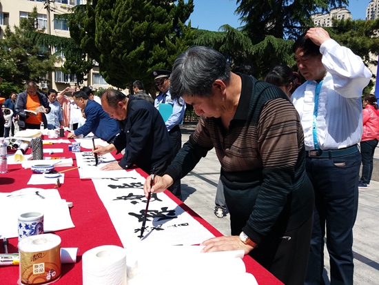 来自青岛书画协会的书画家、街道各社区绘画爱好者和辖区中小学生在卷轴、T恤上尽情泼墨挥毫,纵笔挥洒,自由创作,回忆旧时光,憧憬新未来。书画家现场为美丽青岛献上墨宝,学生们以记忆中的家乡为原型,在T恤上创作风格各异的绘画作品。大家用手中的画笔绘画自己心中的青岛,抒发自己对家乡、对祖国无限热爱的美好情感。