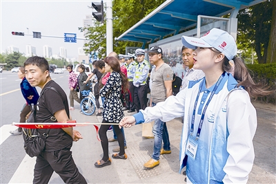 在香港中路一处人行道,志愿者娄弘敏引导市民有序通过马路。杨志文 摄
