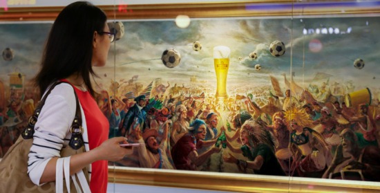 此次主题为“新地壳运动”的油画均为原作展出,在地铁尚属首次。三幅各长达3.6米的油画画面极具魔幻风格,描绘了自“大陆漂移”后,世界分成七大洲,在2018年足球盛会来临的时候,俄罗斯足球健将向全世界踢出足球,借助连在足球上的绳子,球迷们把各大洲与欧亚大陆拉在一起,使分散四处的大陆又连成一片,地球终于回到完整一块巨大陆地。全世界的球迷“欢聚俄罗斯,为世界举杯”的震撼一刻,这正是青岛啤酒在这个足球季的宣传主题。