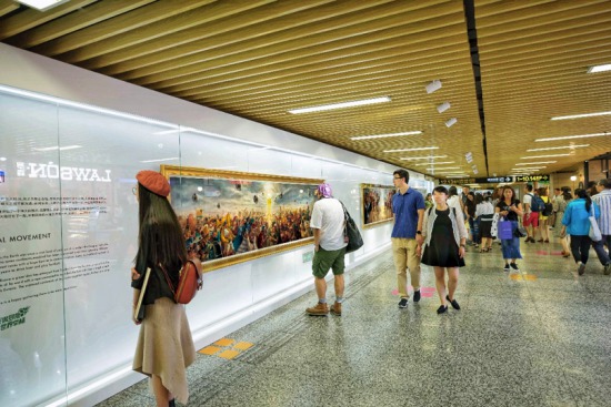 在上海徐家汇地铁站,本打算周末出门逛街的人们却毫无防备地“闯入”了一场气势磅礴的“油画艺术展”。展览从地铁一端开始,铺满了长达几十米的行人通道。平日里人流如织的徐家汇地铁站顿时变得安静下来,多了几分美术馆现场即视感。行人们放慢脚步,在这个艺术长廊前踱来踱去细细观赏,现场更有激动合影的铁杆球迷、安安静静临摹油画的艺术系学生等。
