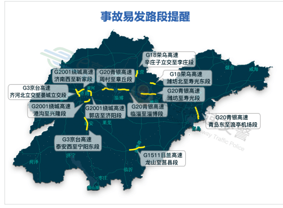 往年端午期间,G35济广高速、G2001济南绕城、G15沈海高速、G3京台高速、G1511日兰高速、G20青银高速部分路段轻微事故易发,且在发生的所有交通事故类型中,以追尾事故为主。山东高速交警提醒途径以上路段的驾驶人要严控车速,集中精力,谨慎驾驶。