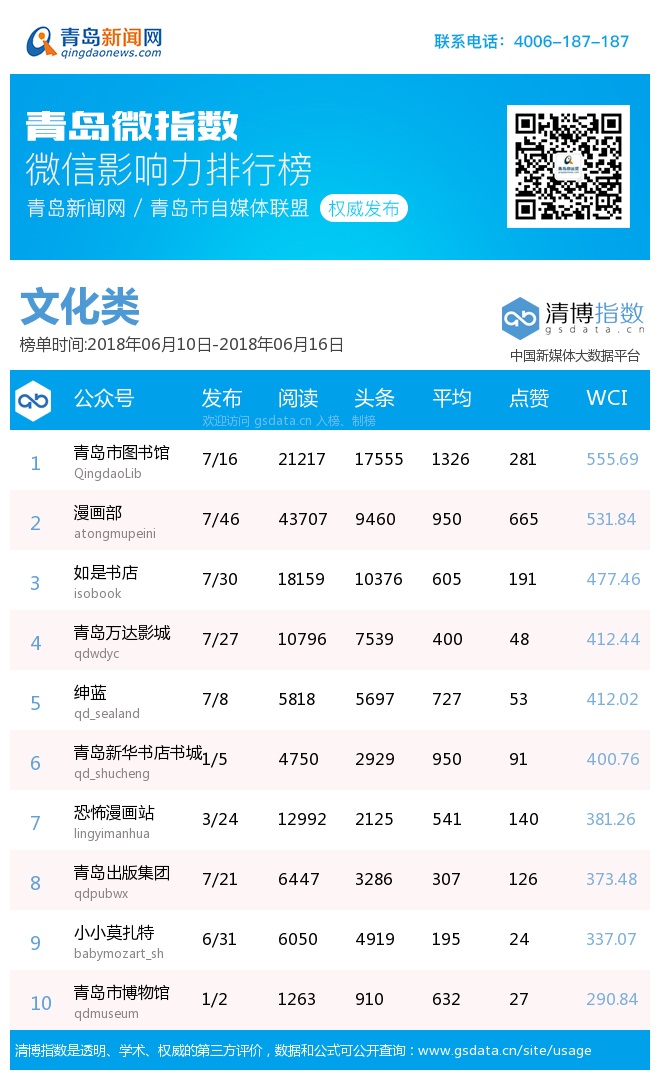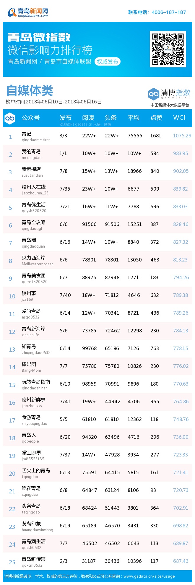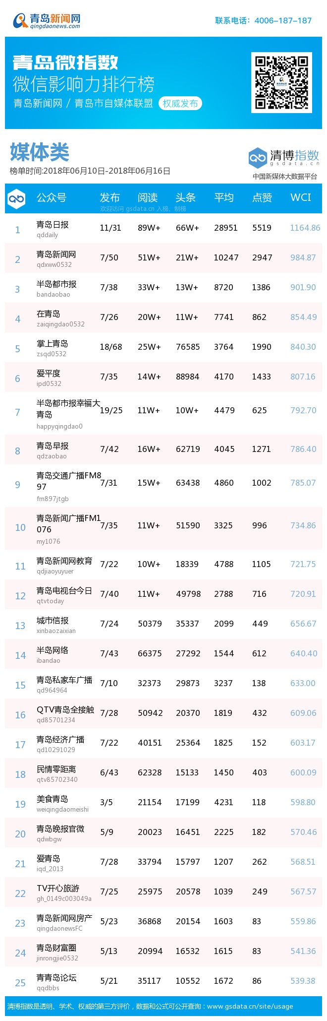 青岛新闻网6月20日讯(记者 邢书玲)由青岛新闻网、清博指数平台联手打造的“青岛微指数微信影响力排行榜”今日发布一周(6.10—6.16)榜单。