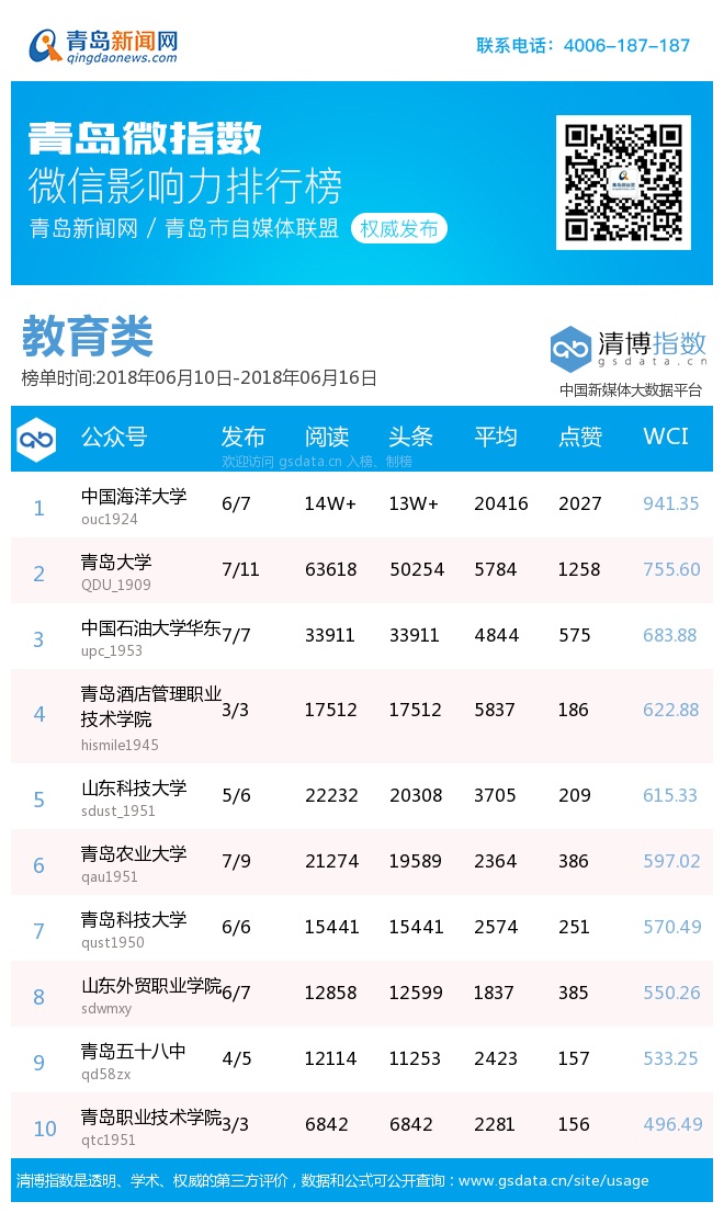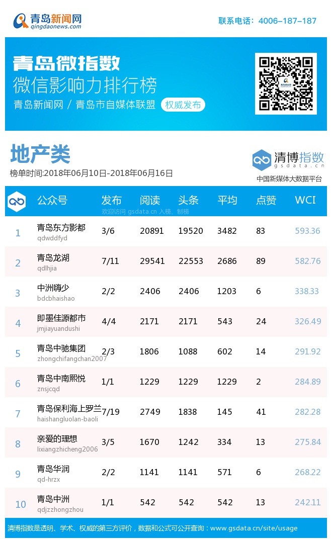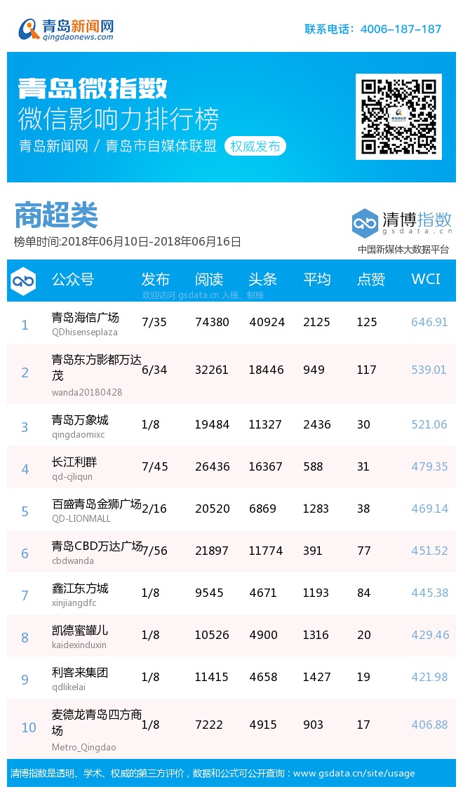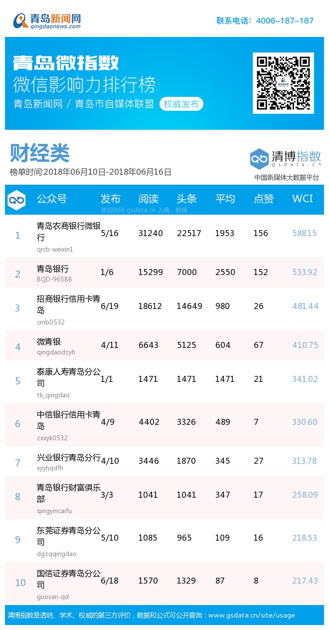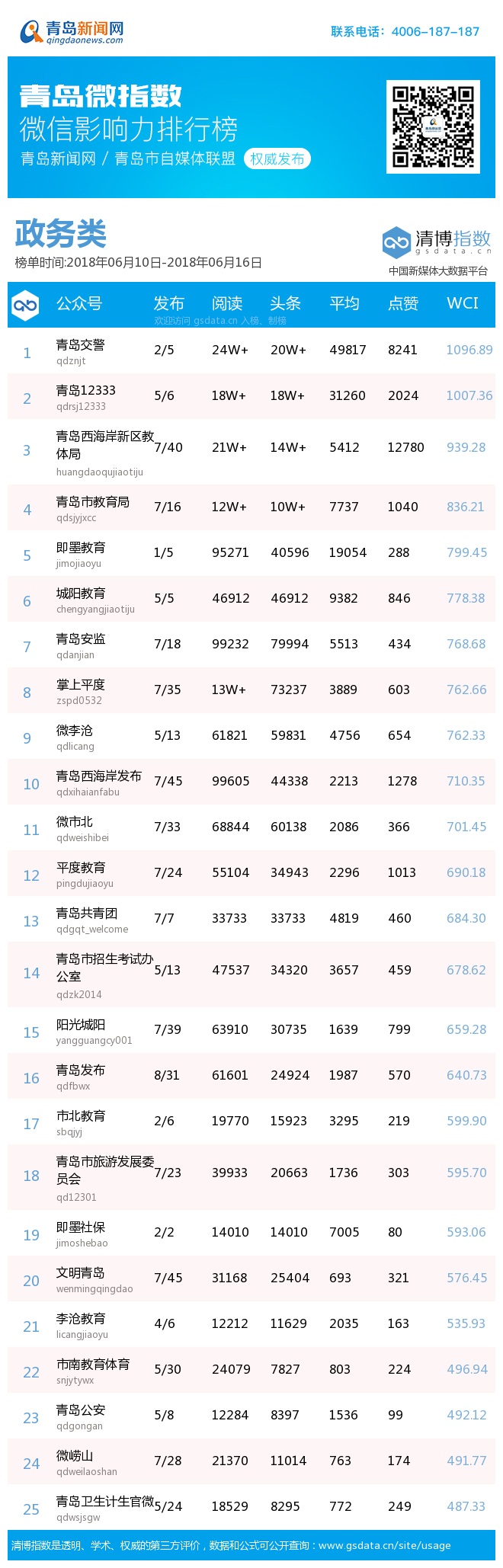 青岛新闻网6月20日讯(记者 邢书玲)由青岛新闻网、清博指数平台联手打造的“青岛微指数微信影响力排行榜”今日发布一周(6.10—6.16)榜单。