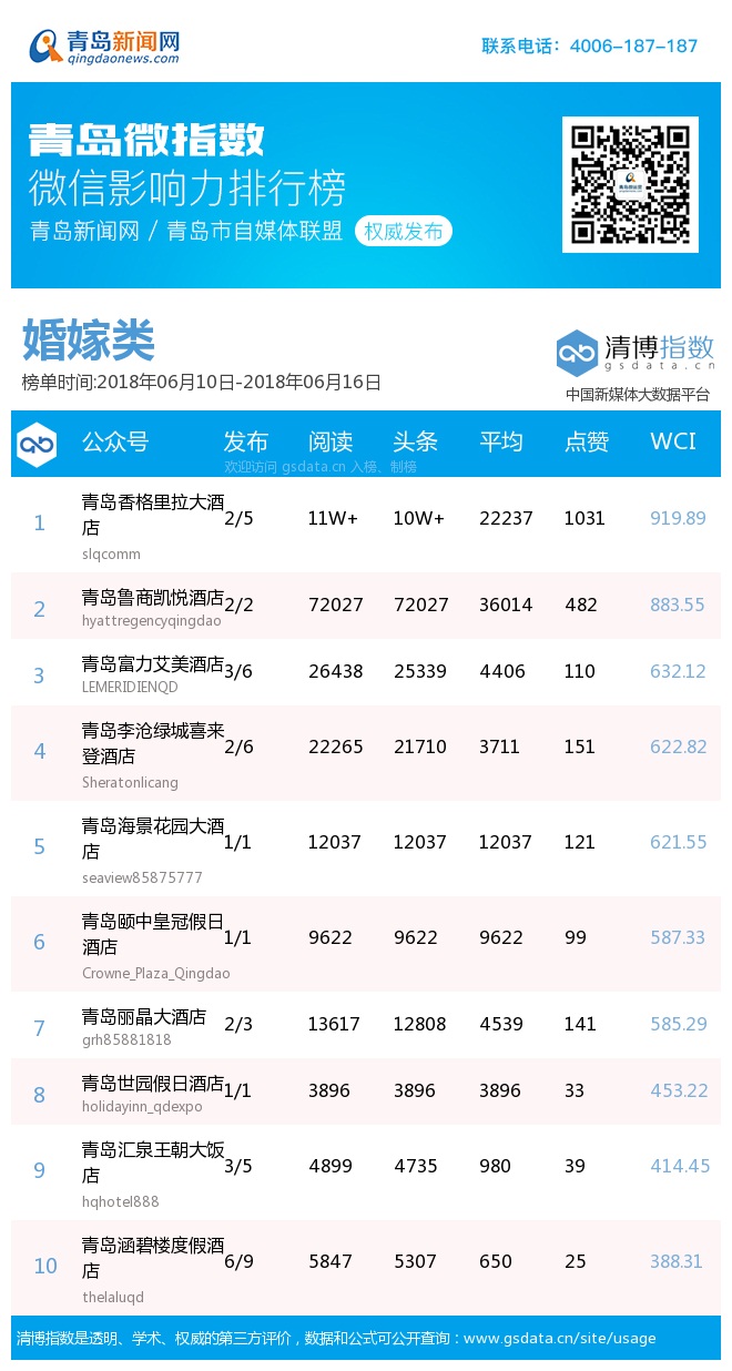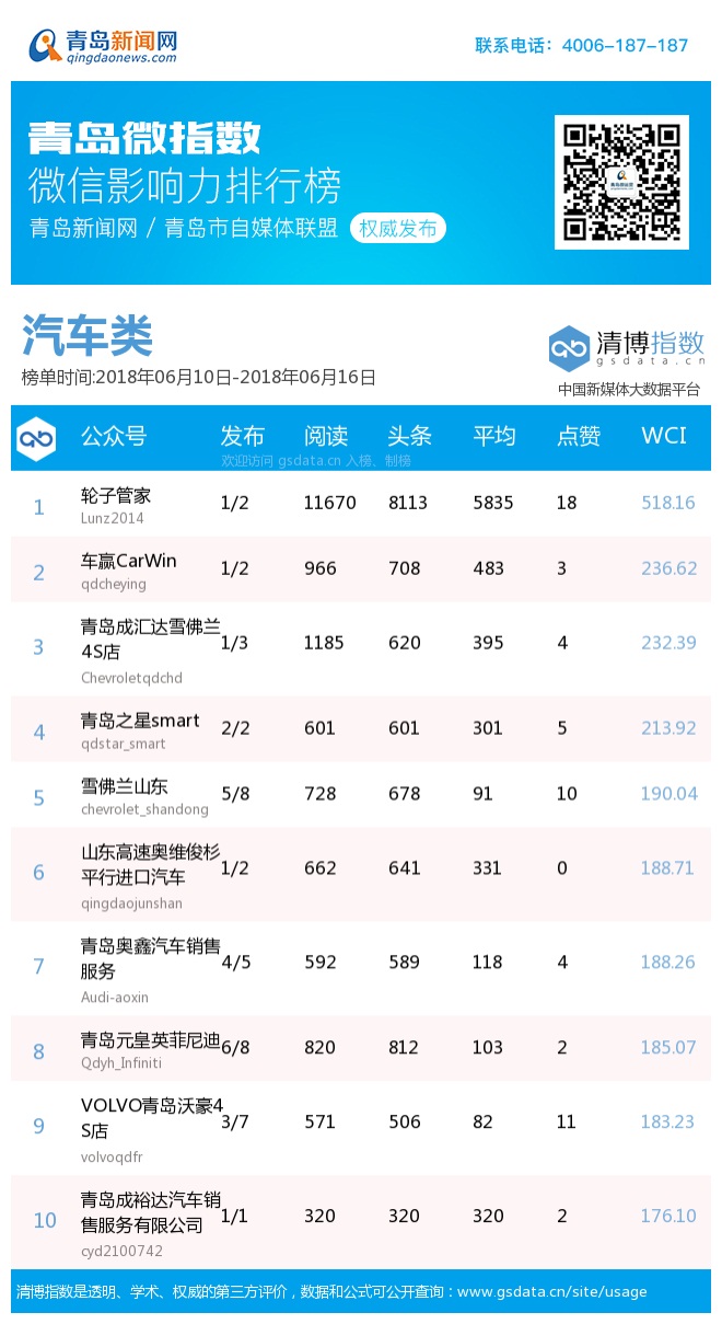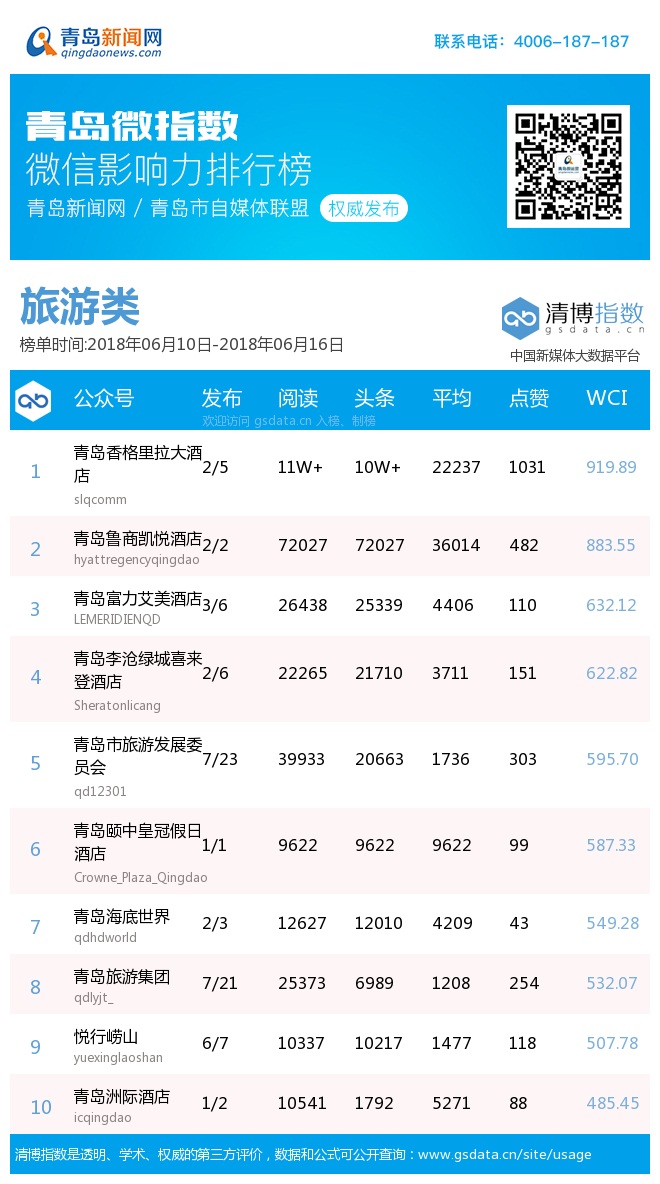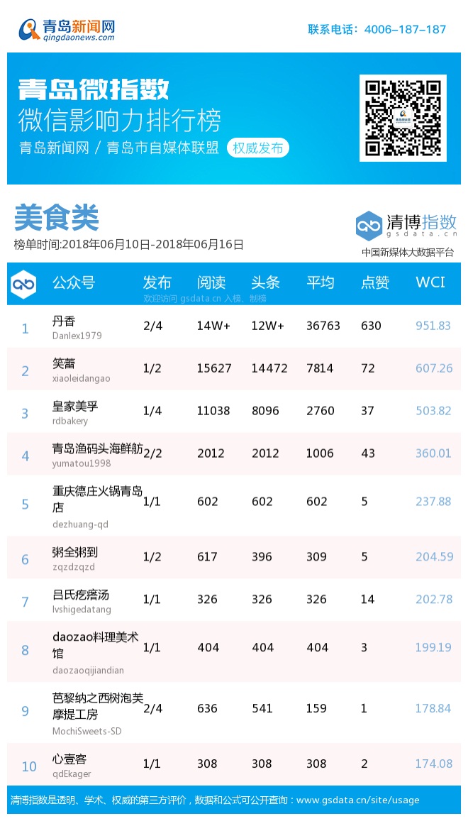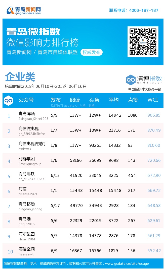 3、本次榜单收录了青岛14个行业微信公众号,如您的账号暂未收录,可联系4006-187-187。