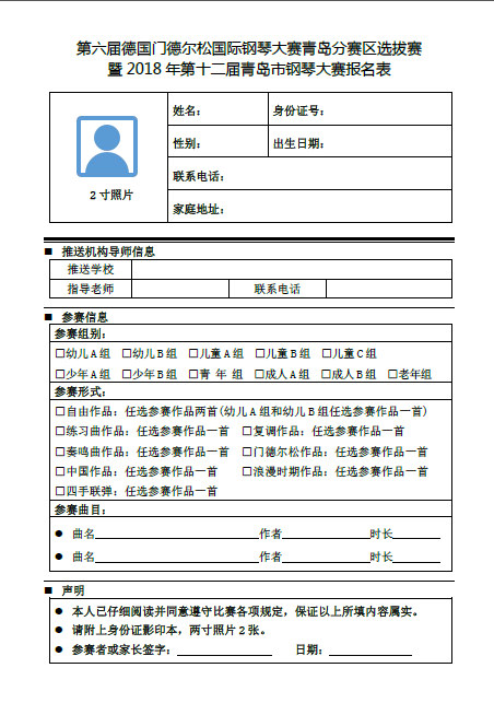 注:参加本次大赛可同时获得第六届德国门德尔松国际钢琴大赛青岛分赛区选拔赛证书和2018年第十二届青岛市钢琴大赛证书,一赛双证书。
