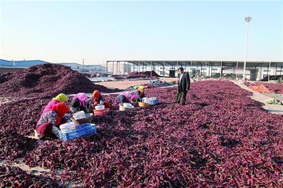 仓库里堆成小山的红辣椒,车间内机器飞转,经过长长的流水线,被加工成辣椒粉、辣椒酱等产品,出厂后即直接装车走上欧美之旅。