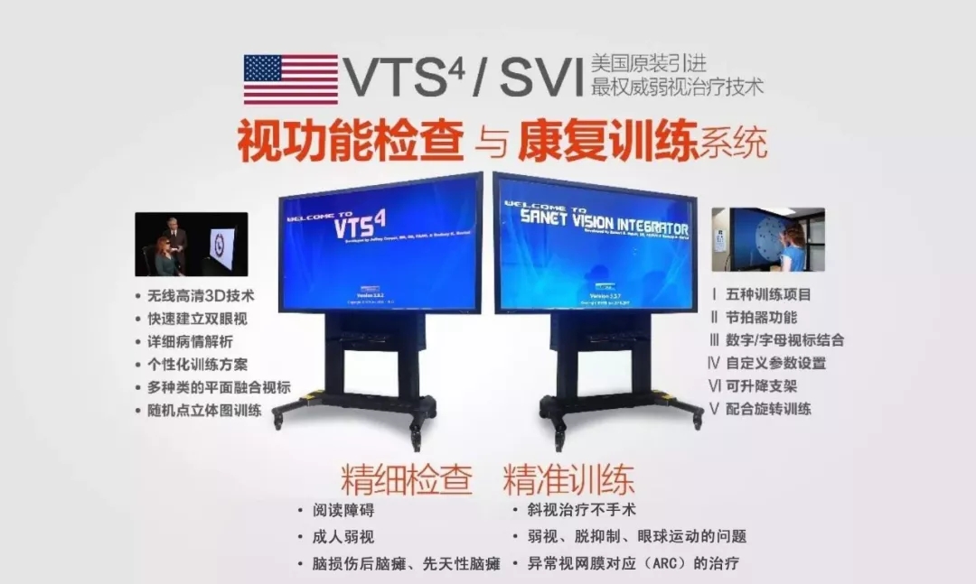 圣爱眼科与北京嘉铖视欣多年来在青少年近视防控、视力矫正和斜弱视治疗等方面,无论在理论研究、技术实力,还是仪器设备上,永远是站在国内前沿。能够急家长之所急,想家长之所想,解决一系列疑难问题。圣爱眼科新引进的美国VTS4视知觉训练系统和SVI脑知觉训练系统,在眼科、眼视光领域是一次技术性的飞跃,其打破了传统弱视治疗的思维,是颠覆性的斜弱视治疗。目前已经解决了很多以前无法治疗的弱视案例,突破了年龄限制、突破了手术限制、可提升阅读学习能力,并对脑瘫、外伤性脑损伤提供康复训练等。