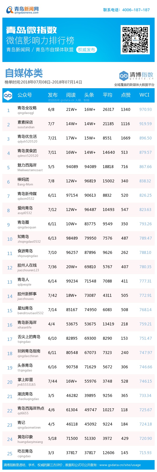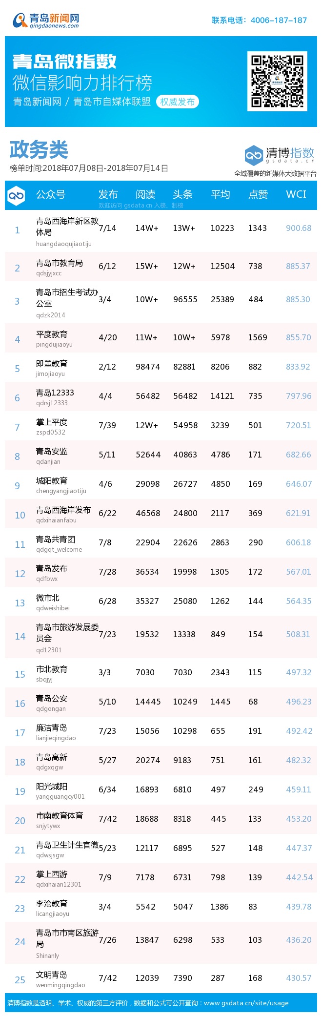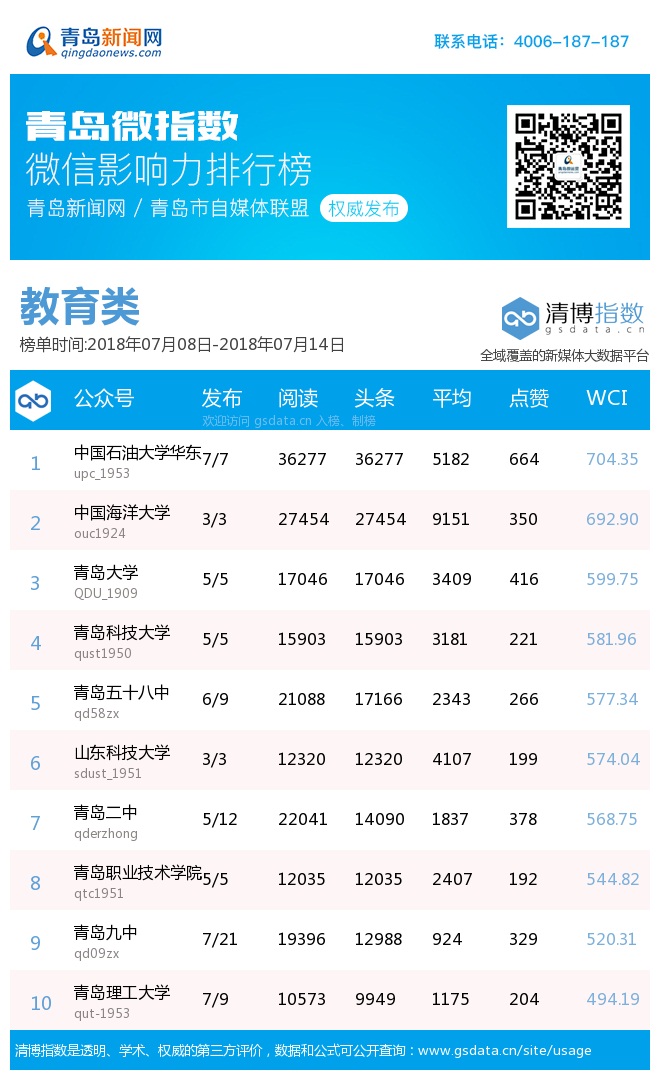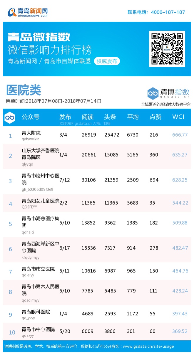 青岛新闻网7月16日讯(记者 邢书玲)由青岛新闻网、清博指数平台联手打造的“青岛微指数微信影响力排行榜”今日发布一周(7.8—7.14)榜单。