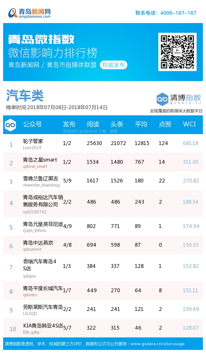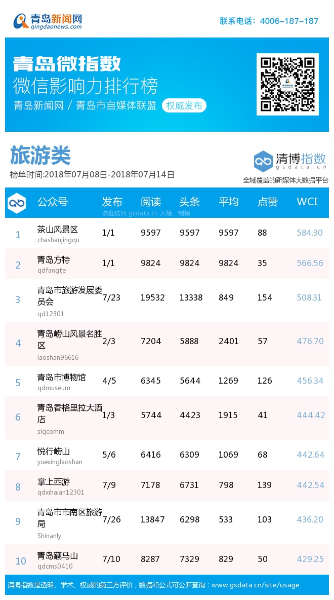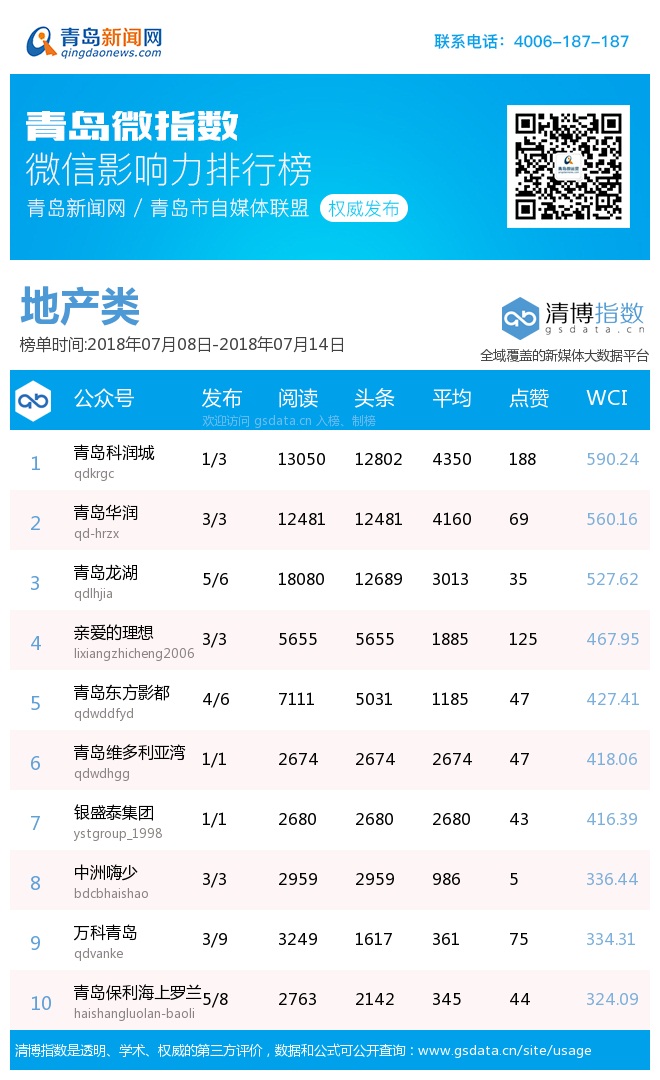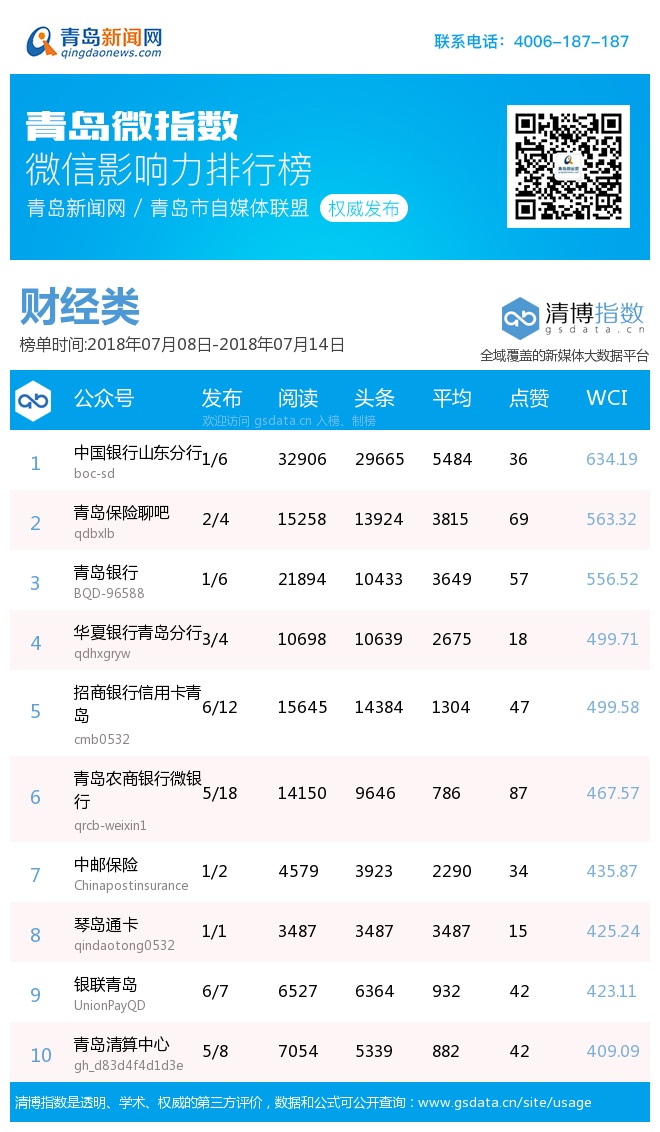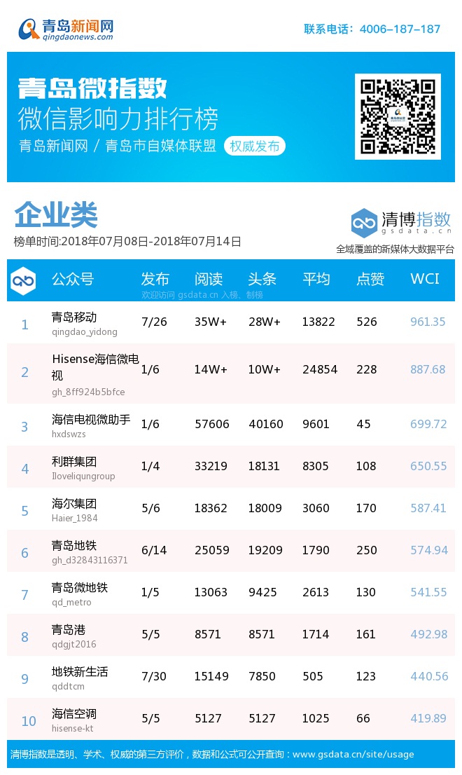 3、本次榜单收录了青岛14个行业微信公众号,如您的账号暂未收录,可联系4006-187-187。
