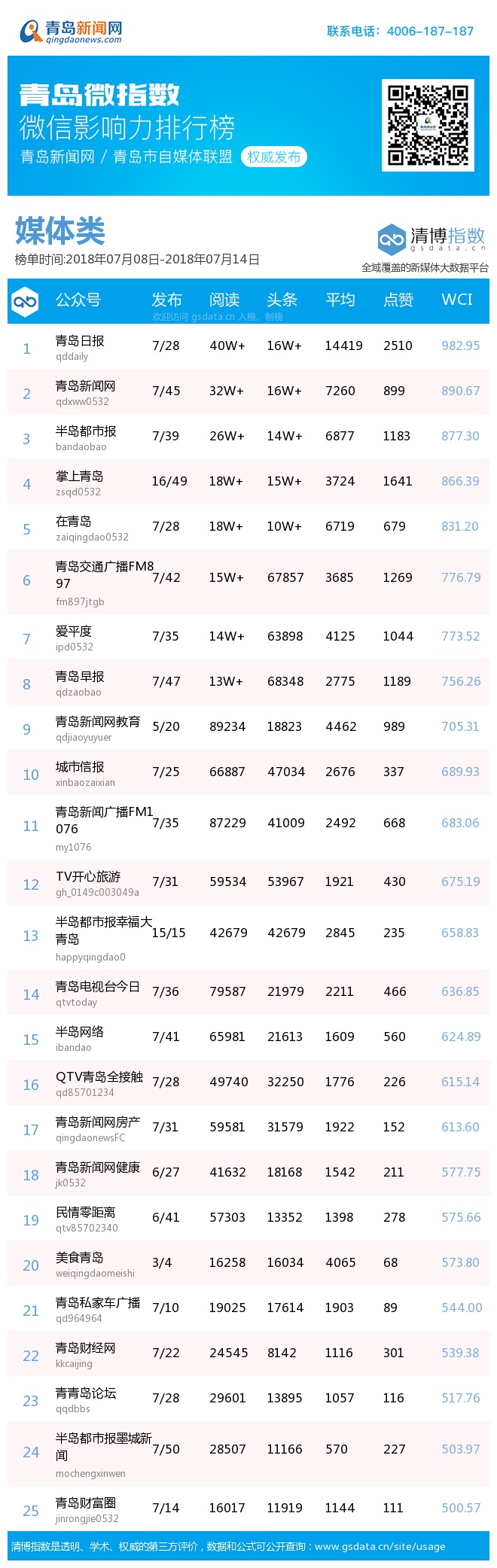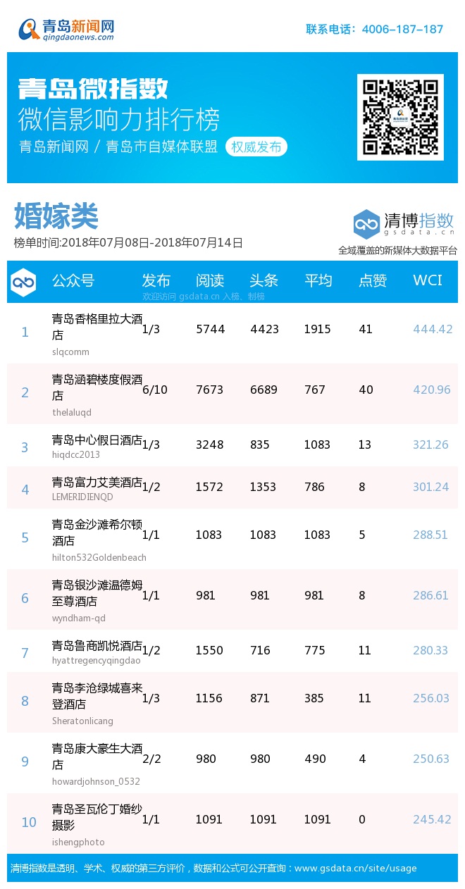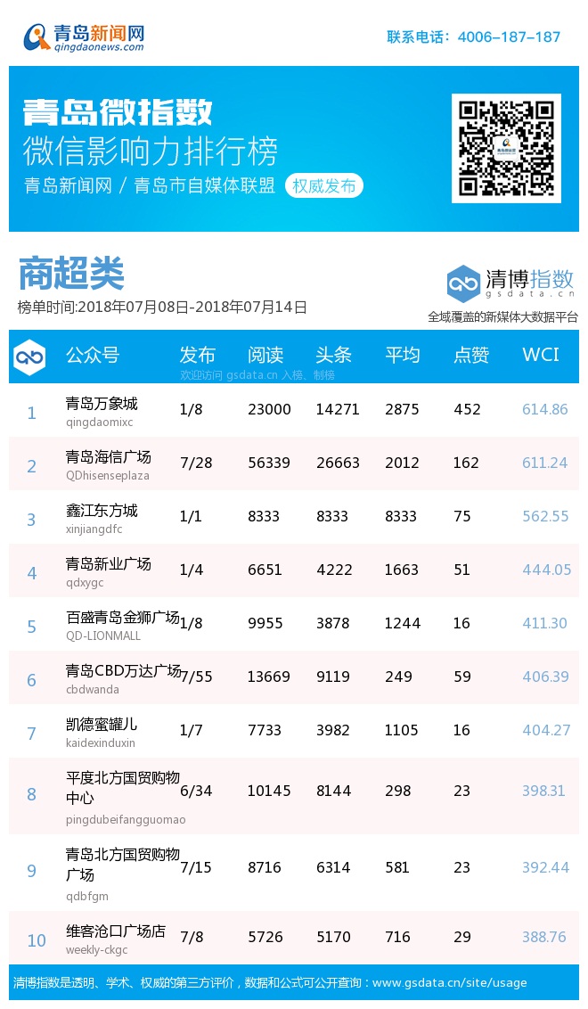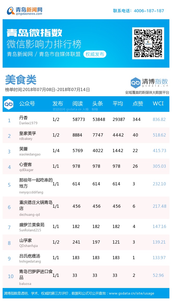 3、本次榜单收录了青岛14个行业微信公众号,如您的账号暂未收录,可联系4006-187-187。