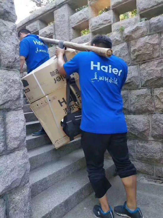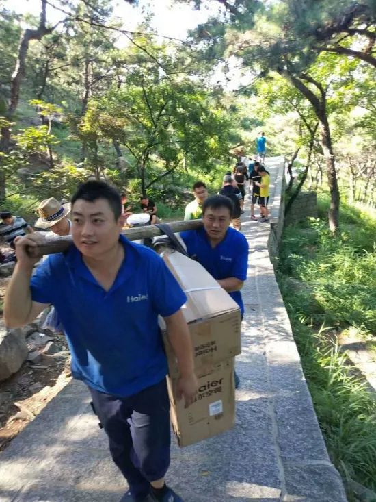 海尔空调服务工程师回忆,虽然游客游览景区可以乘坐一段路程的缆车,但是运送空调这类大家电只能通过石梯。沿途有些地方石阶较窄,只能容许一人通过,增加了运送空调的难度。“支架、内外机和安装工具加起来超过100斤,从山下到道观一路抬着走,比平时游人登山的时间要多出1倍。”