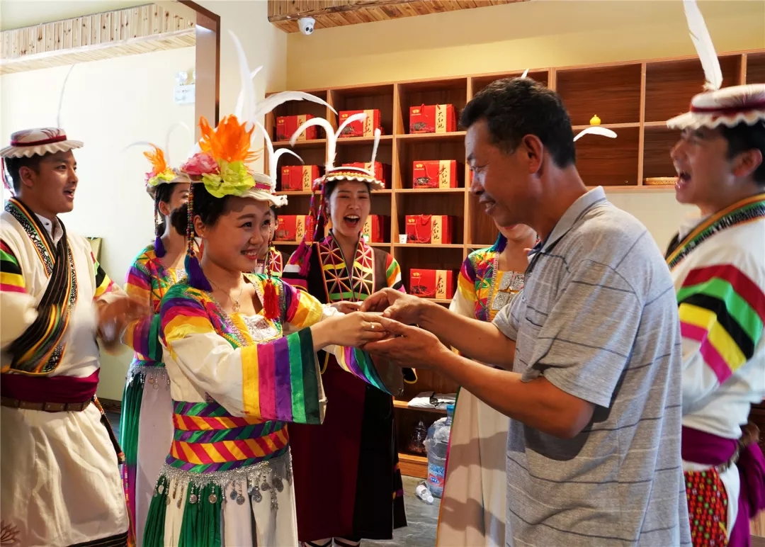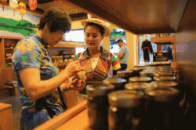 店员邀请游客品尝咂杆酒