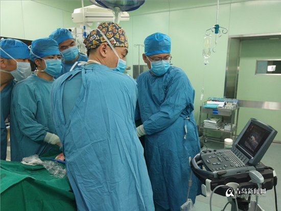手术当天,麻醉科主任王明山带领医生们,先为小祁自体采血400ml,以备术中回输;为了减少疼痛,在术前和术后,麻醉手术科张高峰医生在超声引导下,为小祁进行了双侧腹横肌平面阻滞及腹直肌后鞘阻滞;东院心外科副主任牛兆卓、麻醉手术科张彦平等坐镇手术台旁,随时准备建立体外循环。