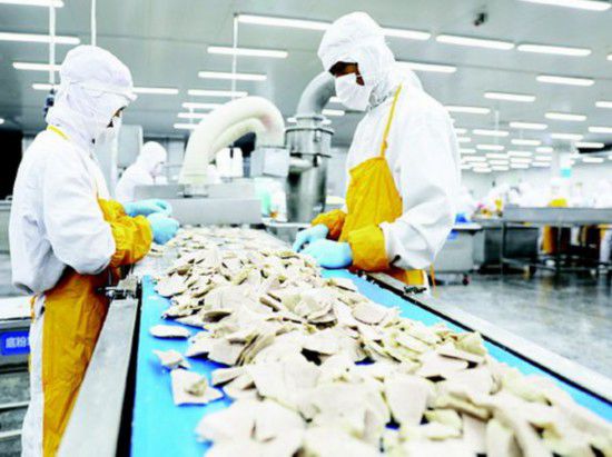 荣成市泰祥集团一车间内,工人们正在加工出口食品。