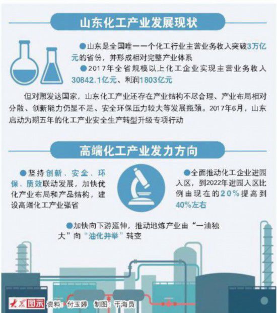 习近平总书记视察山东时嘱托“要坚持腾笼换鸟、凤凰涅槃的思路,推动产业优化升级”。对照这一要求,盯紧安全、环保、创新、质效联动发展,山东一手抓猛药去疴,一手促提质增效,化工产业迎来蝶变。
