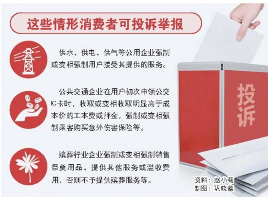 “我们欢迎社会各界和消费者向当地工商、市场监督管理部门投诉举报供水、供电、供气、公共交通、殡葬等行业企业涉嫌违反《反垄断法》《反不正当竞争法》的行为。”山东省工商局公平交易局三级主任科员崔云芳表示,“比如供水、供电、供气等公用企业强制或变相强制用户接受其提供的服务,公共交通企业在用户初次申领公交IC卡时,收取或变相收取明显高于成本价的工本费或押金,强制或变相强制乘客购买意外伤害保险等。殡葬行业企业强制或变相强制销售祭奠用品、提供其他服务或滥收费用,否则不予提供殡葬服务等。”