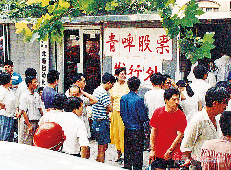 ▲在改革开放之初,青岛啤酒某种程度上就是青岛的形象大使。图为1993年7月15日,青啤股票上市。(资料图)