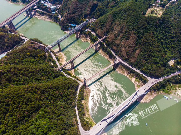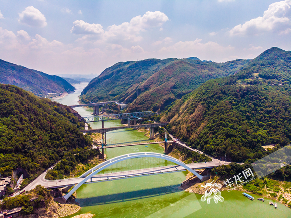 北碚区嘉陵江观音峡段,远远望去,朝阳桥及其复线桥、襄渝铁路嘉陵江大桥及其复线桥、兰渝铁路大桥、遂渝铁路大桥六座大桥交错层叠,将嘉陵碧波与苍翠群山的风景有序分割开来,勾勒出一道壮丽风景。