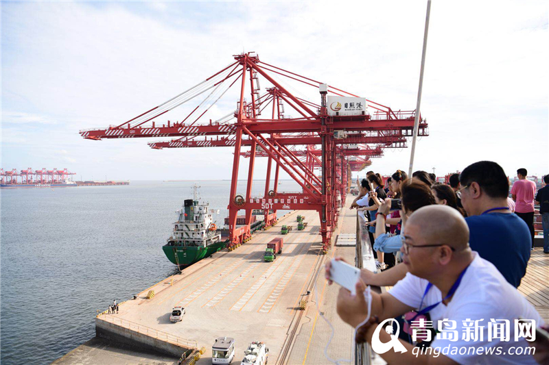13日,由全国各地50多家媒体的70余名记者、理论专家和优秀网评员组成的第十四届中国网络媒体山东行采访团走进日照港。采访团记者从高处俯看日照港码头,成千上万的集装箱整齐有序地排列延伸,林立的门机拔地而起,远处,货轮的汽笛划破天际,港口呈现蒸蒸日上的景象。