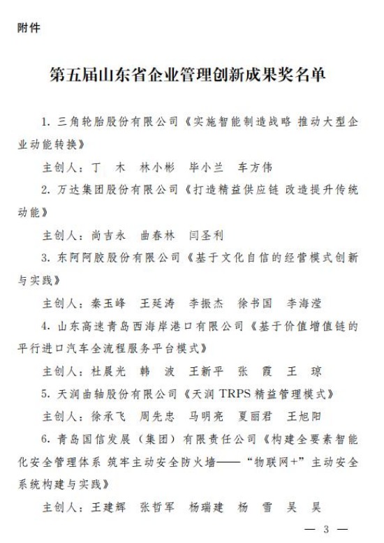 近年来,全省广大企业切实把加强管理作为加快新旧动能转换的重要战略举措,涌现出了一大批特色突出、实用性和创新性强、层次水平高、有较大推广价值的优秀企业管理创新成果,有力推动了全省企业管理水平和经济效益的提高。为引导和激励广大企业进一步加强管理,提高发展质量和效益,省政府决定,授予三角轮胎股份有限公司《实施智能制造战略推动大型企业动能转换》等20个创新成果“第五届山东省企业管理创新成果奖”。