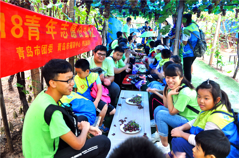 秋高气爽,天气褪去了夏日的燥热,又到了果实成熟的时候。剪下一串晶莹剔透的“水晶玛瑙”,浸在清水中镇一下,放在口里真是又清凉又甜润 。由青岛团市委、青岛福彩、青岛新闻网主办的“2018青年公益课堂”又开课啦!9月16日,来自青岛盲校的20名同学与来自基隆路小学的20个志愿者家庭一对一结对,来到位于城阳区夏庄街道的宫家村社区,一起走进葡萄园,一起参户外活动,体验采摘的乐趣,感受游戏的快乐。