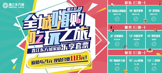 一张套票,吃喝玩乐样样俱全!贴心的服务、时尚的游乐还有美味的饕餮盛宴一张套票全搞定,想你所想,给你所想!原价421元,现价只需118元,国庆逛东方城的首要之选!