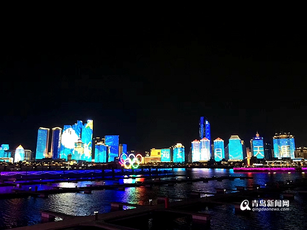 五四广场/奥帆中心灯光秀彰显中秋节日气氛。