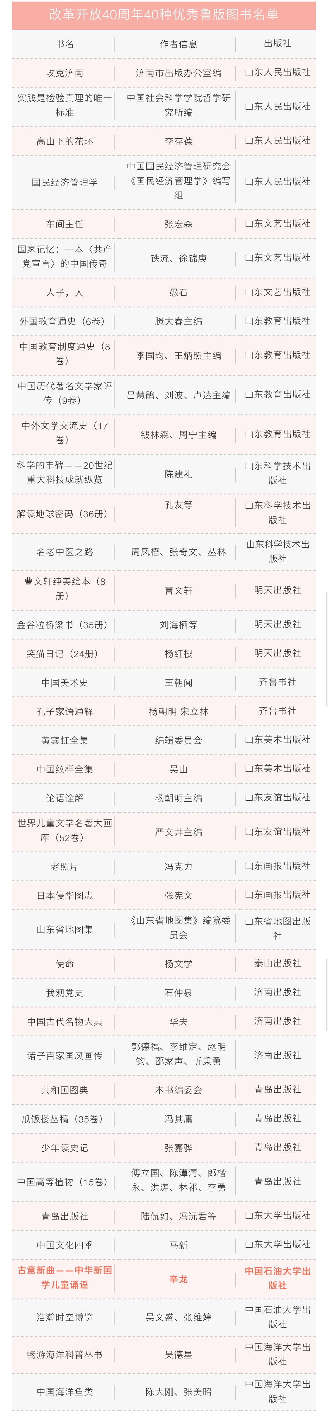 青岛新闻网9月30日讯 为纪念改革开放40周年,充分展示我省40年来出版业取得的辉煌成就和鲁版图书的影响力,大力推动全民阅读,加快建设书香山东,进一步激发出版业改革发展新动能,省委宣传部、省新闻出版广电局、山东广播电视台联合开展了“改革开放40周年40种优秀鲁版图书”评选活动。经过出版社自荐、网络投票、专家评审,最终评出40种优秀鲁版图书。平度籍作家辛龙著,由山东大学出版社出版的《古意新曲——中华新国学儿童诵谣》入选。