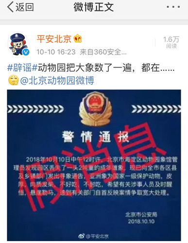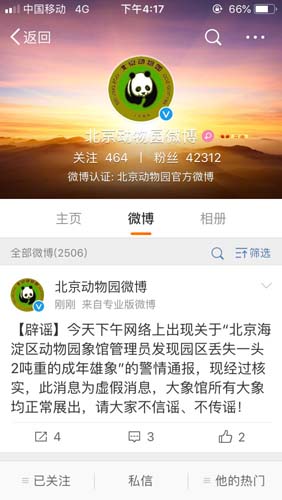 10月10日,北京动物园官方微博辟谣称,10日下午网络上出现关于“北京海淀区动物园象馆管理员发现园区丢失一头2吨重的成年雄象”的警情通报,现经过核实,此消息为虚假消息,大象馆所有大象均正常展出,请大家不信谣、不传谣。