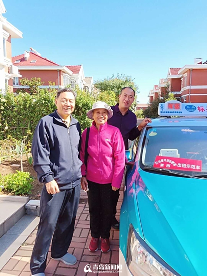 鲁BTE213标兵车驾驶员李师傅说:我免费接送一对老人是要去女儿家里过节,老两口在到达目的地后主动要求跟我合影,说每次出门打车都愿意打交运的,不仅服务态度好,驾驶技能也好;