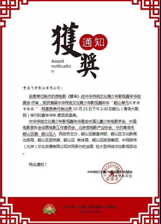 青岛新闻网10月21日讯(通讯员 张丽)日前,经中华传统文化青少年影视嘉年华组委会评审,我市首部传统文化公益微电影《醒来》荣获首届中华传统文化青少年影视嘉年华“崂山单元优秀微电影奖”。