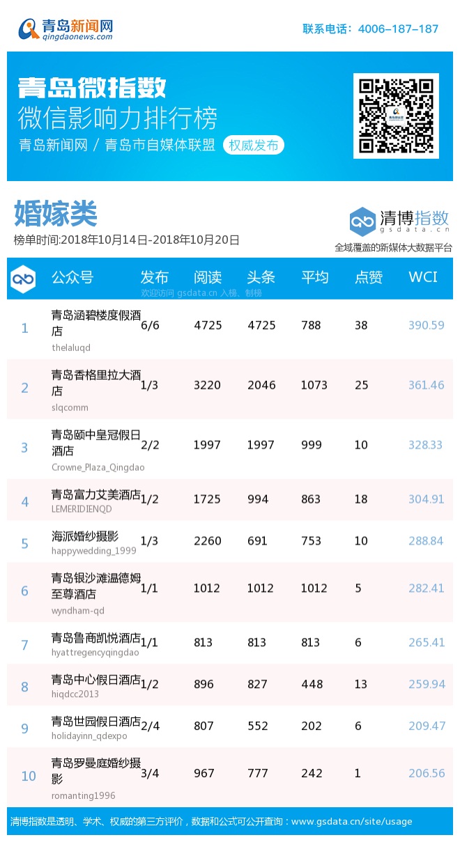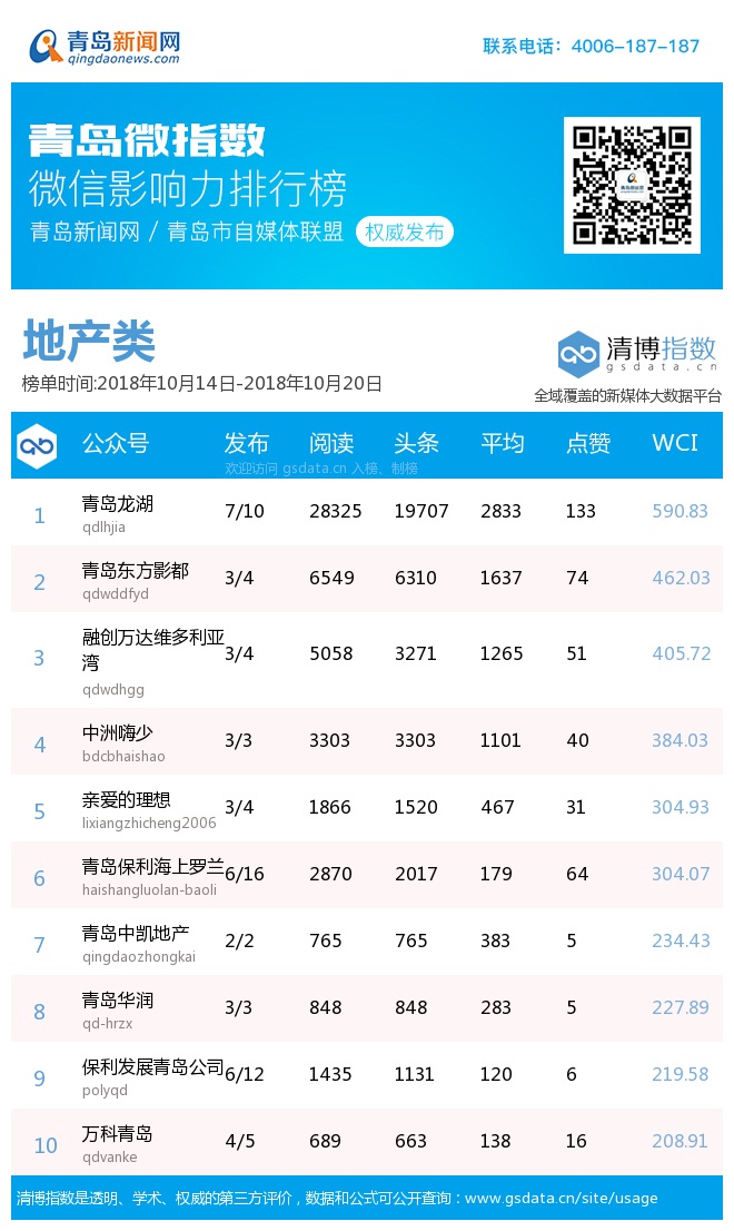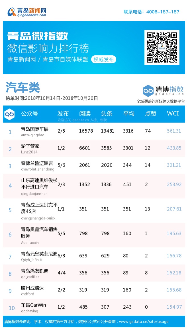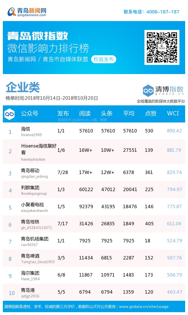 3、本次榜单收录了青岛14个行业微信公众号,如您的账号暂未收录,可联系4006-187-187。
