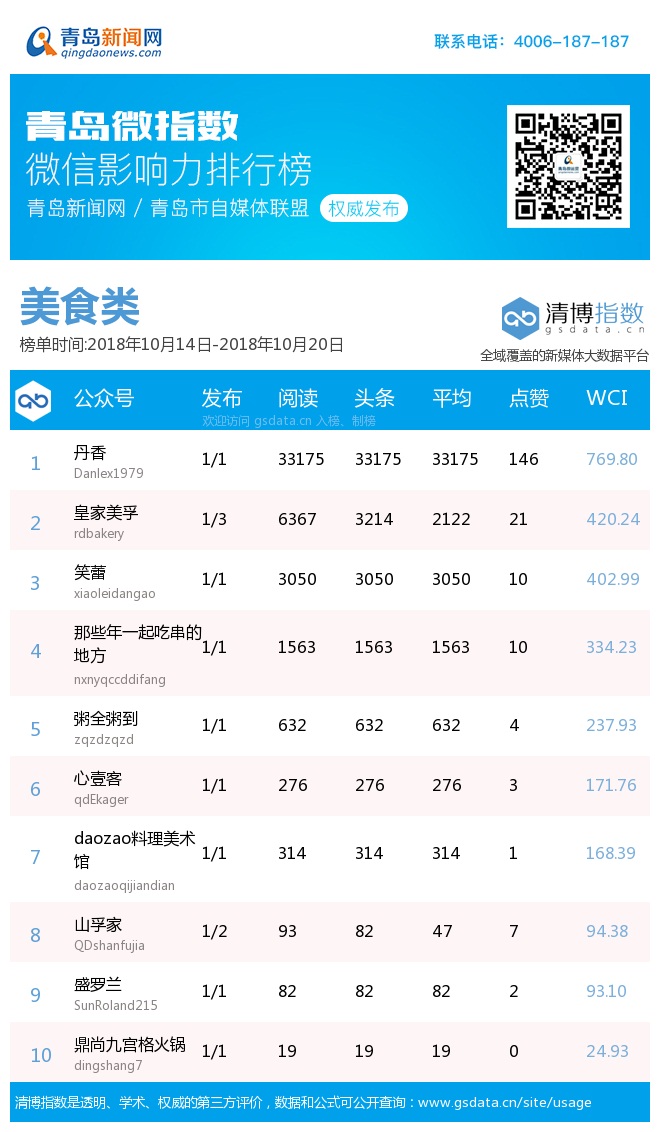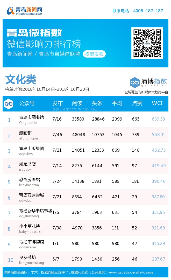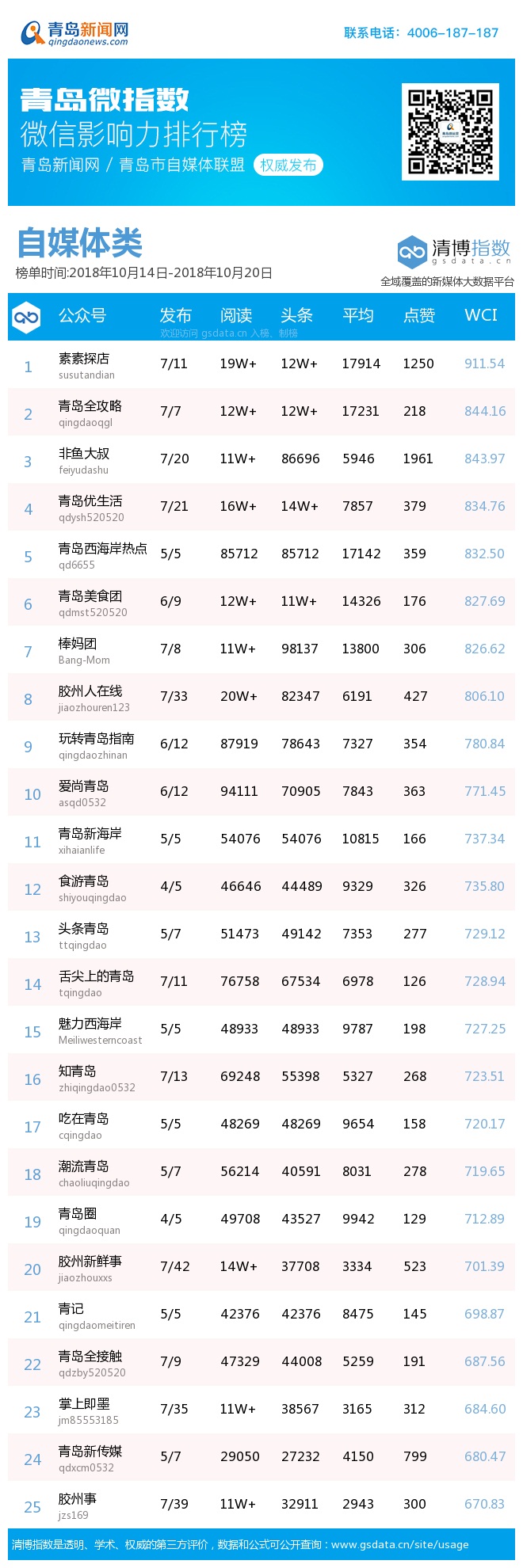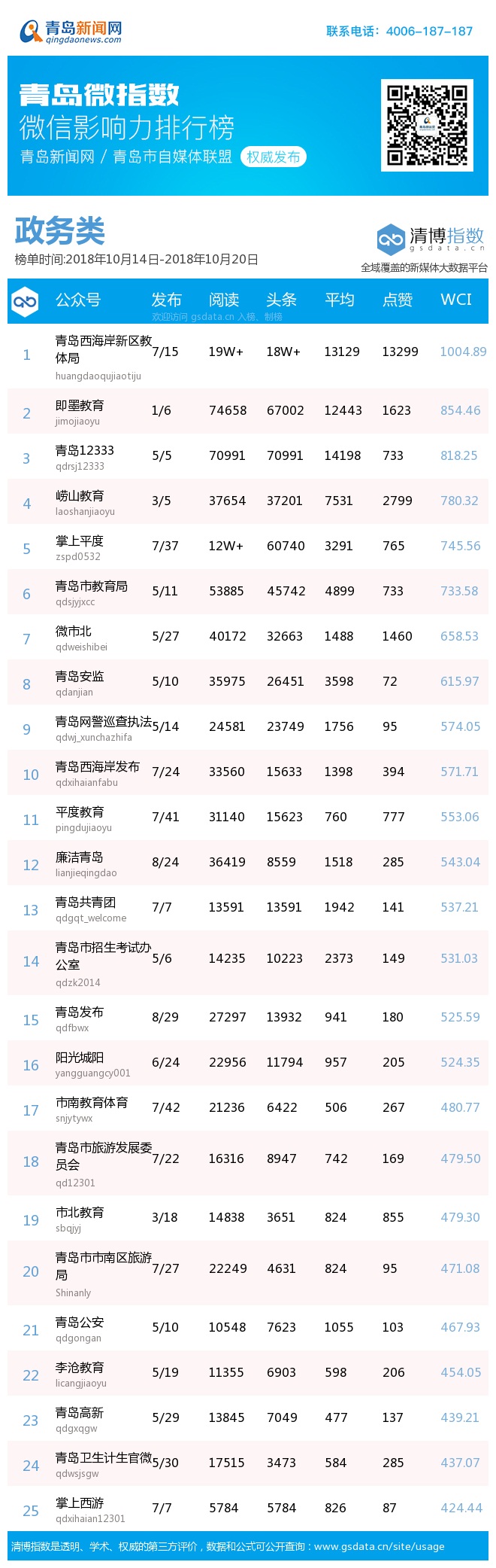 青岛新闻网10月22日讯(记者 邢书玲)由青岛新闻网、清博指数平台联手打造的“青岛微指数微信影响力排行榜”今日发布一周(10月14日-10月20日)榜单。