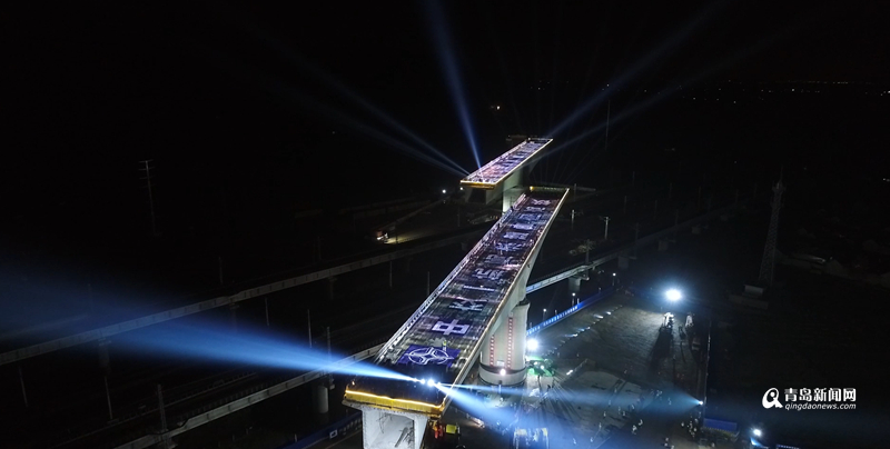 青岛新闻网11月6日讯(记者 任俊峰 通讯员 刘畅)11月4日20:30分,国内高铁最大跨度的悬灌浇注连续梁——鲁南高铁肖家庄特大桥连续梁在空中完成35°转体,这是目前国内高铁建设中跨度最大、梁高最高、距离既有铁路线最近、施工安全风险等级最高以及双T构转体最长的大纵坡连续梁。