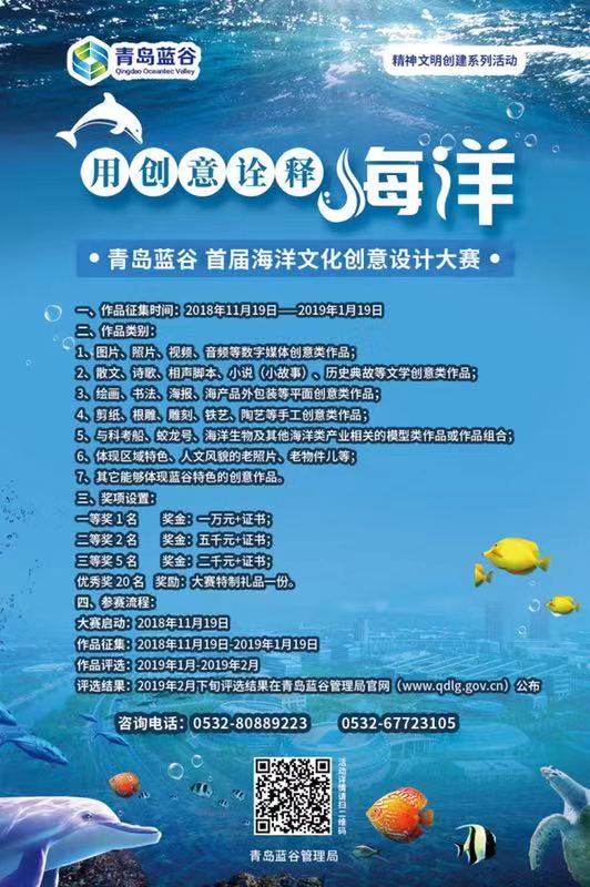 青岛新闻网11月19日讯 为全方位展现蓝谷精神文明建设风貌、诠释美丽海洋,11月19日,由青岛蓝谷管理局主办,半岛传媒承办的“青岛蓝谷首届海洋文化创意设计大赛”拉开帷幕。只要是富有创意、具备设计才华的海洋爱好者,都可以报名参加,作品征集时间将持续到2019年1月19日。