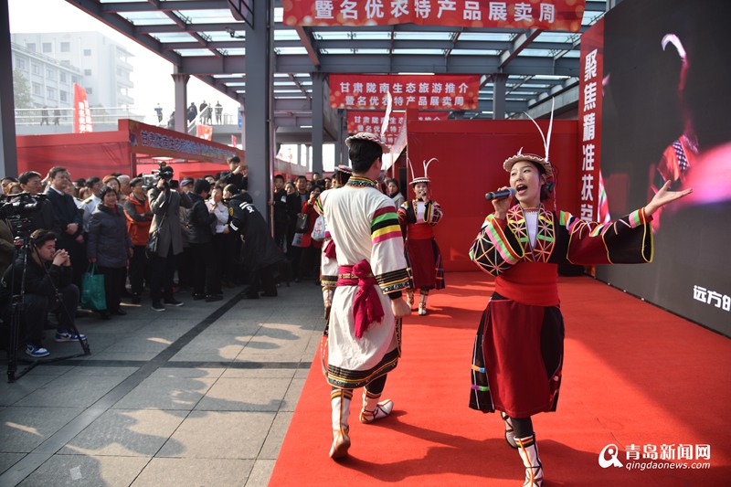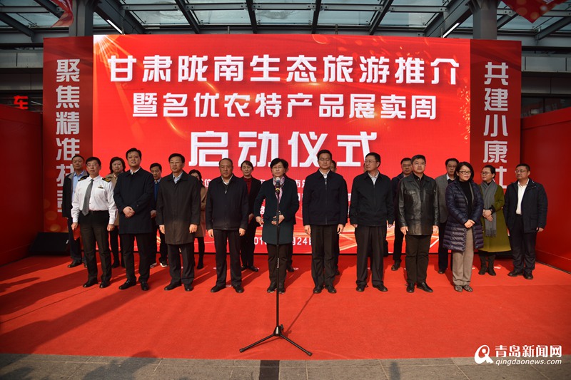 富有地域特色的服饰、热情豪迈的舞姿、友好欢乐的笑容……启动仪式开始前,一场别具风情的陇南民俗文化演出让现场的人们大开眼界,他们纷纷拿出手机拍上几张美照和小视频发到朋友圈中。演出结束后,“陇南生态旅游推介暨名优农特产品展卖周”启动仪式正式开始。青岛市以及对口帮扶的两个城市——陇南市和安顺市的相关领导、交运集团的员工代表参加了启动仪式。