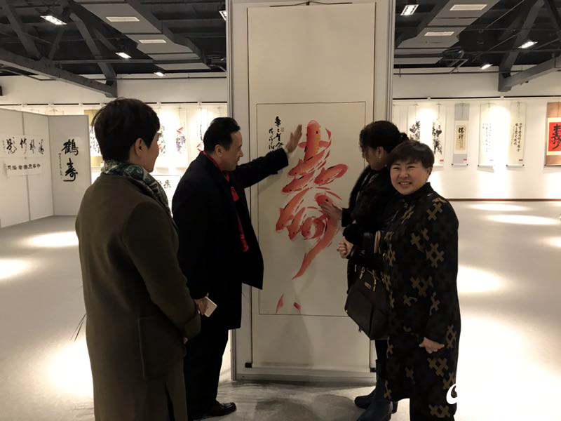 11月18日,在翰墨丹青新世纪·永不落幕书画展厅开幕式上,观众欣赏反笔书法作品。
